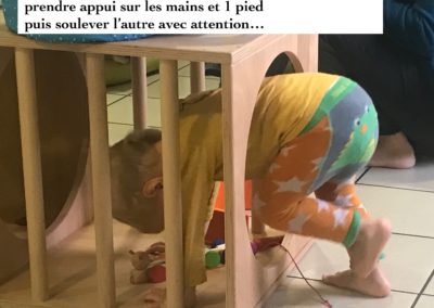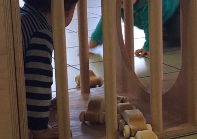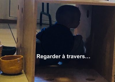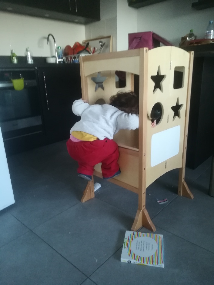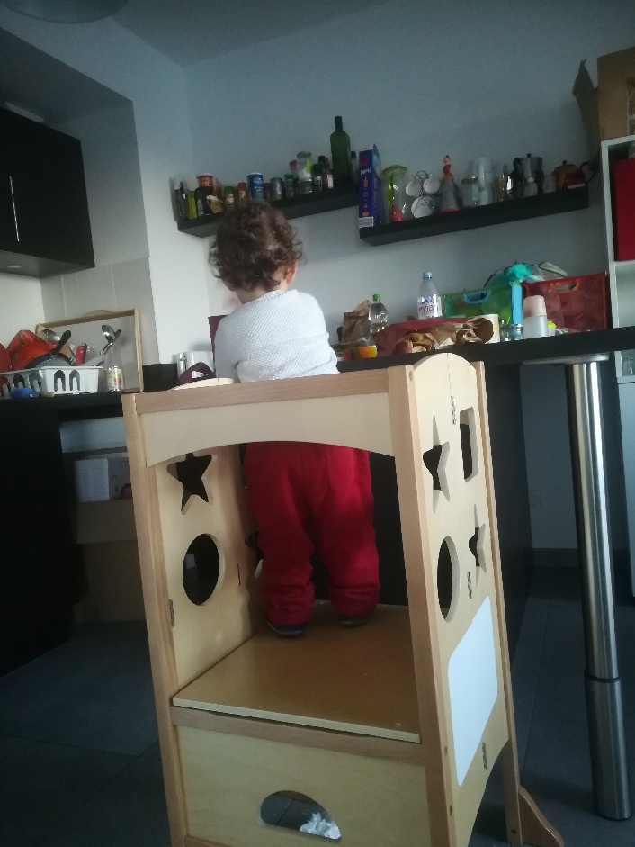 La tour d’observation permet aux enfants de se trouver à la bonne hauteur pour accéder à l’évier ou au plan de travail. L’enfant peut ainsi observer l’adulte en train d’accomplir les tâches de la vie quotidienne et y participer s’il le souhaite.