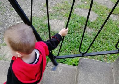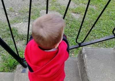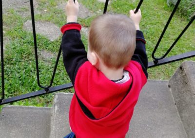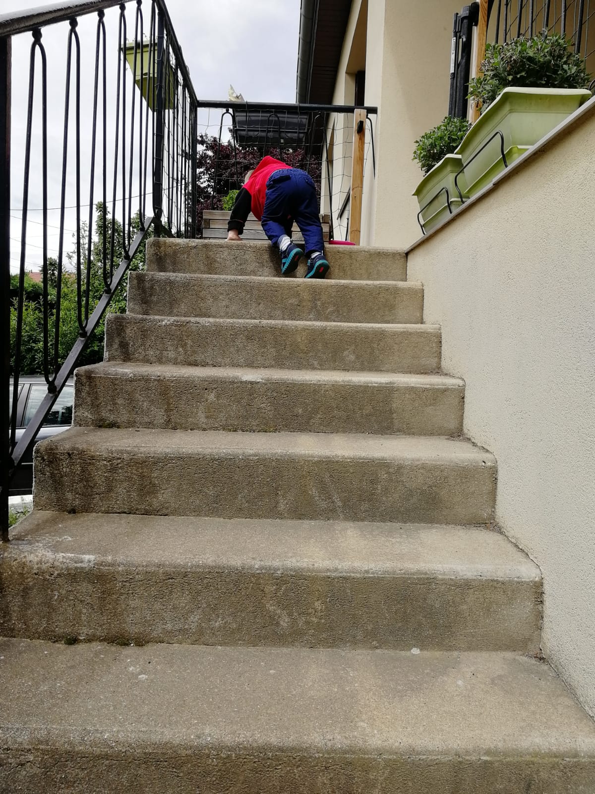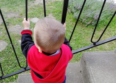 La descente debout, en se tenant à la rambarde