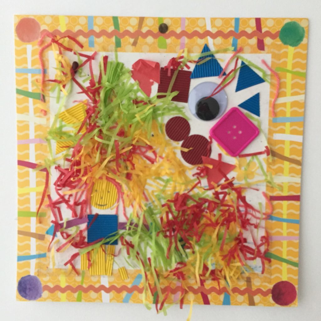 Collage sur carré autocollant avec des papiers et cartons de différentes formes et