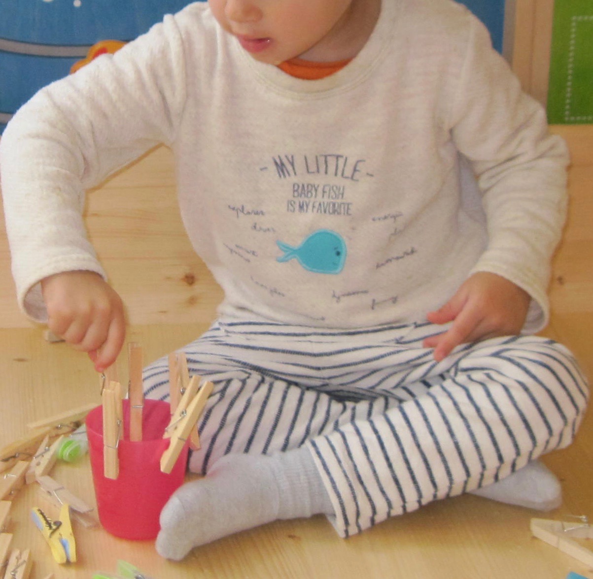 Le petit enfant assis en tailleur sur le sol. Devant lui un gobelet en plastique sur lequel quelques pinces à linge sont accrochées.