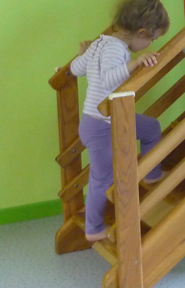 Monter et descendre les escaliers, de sa propre initiative, c’est comme l’enfant le peut au moment où il le fait et de la manière la plus commode pour lui dans la situation rencontrée :