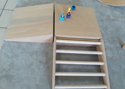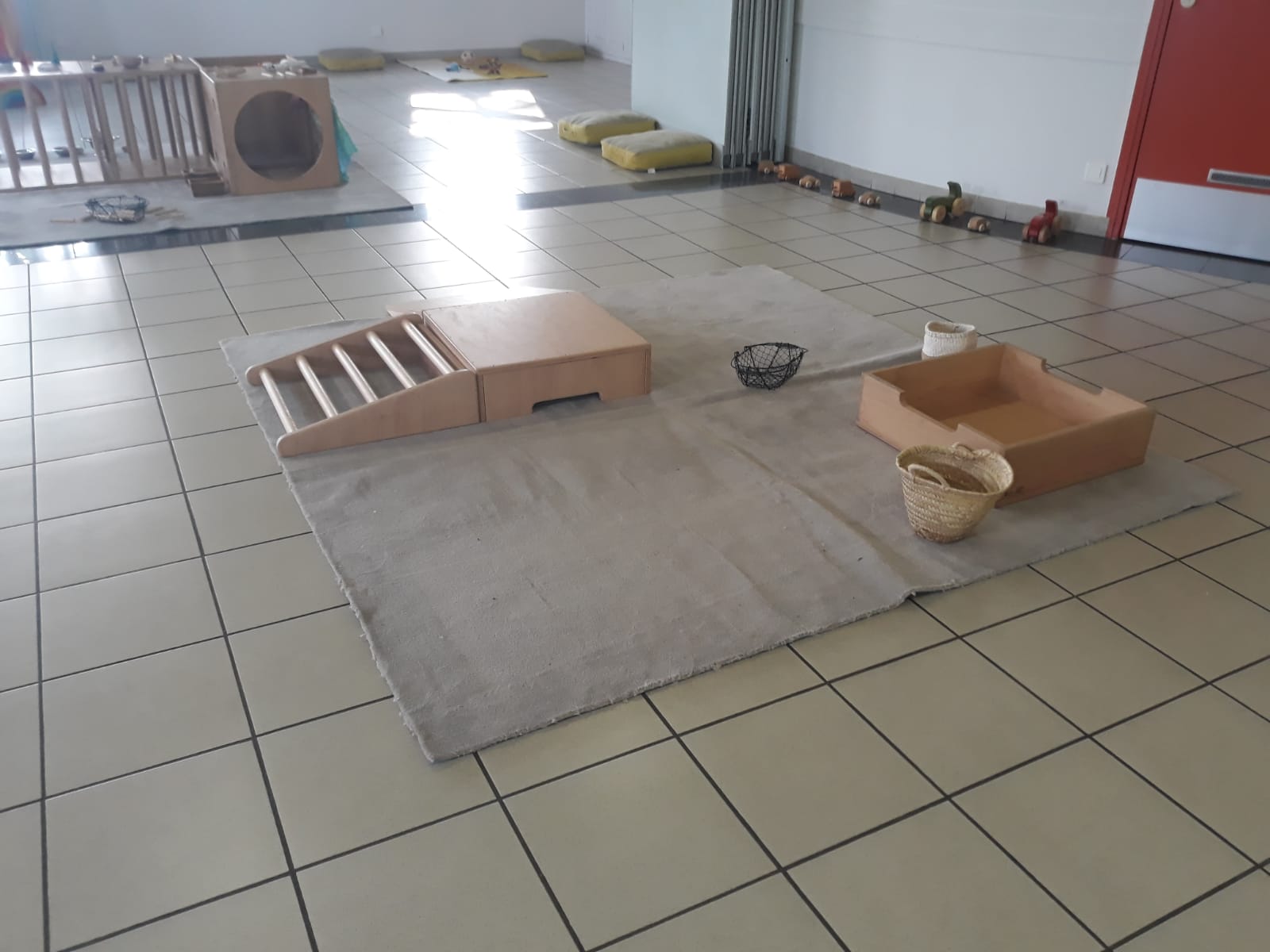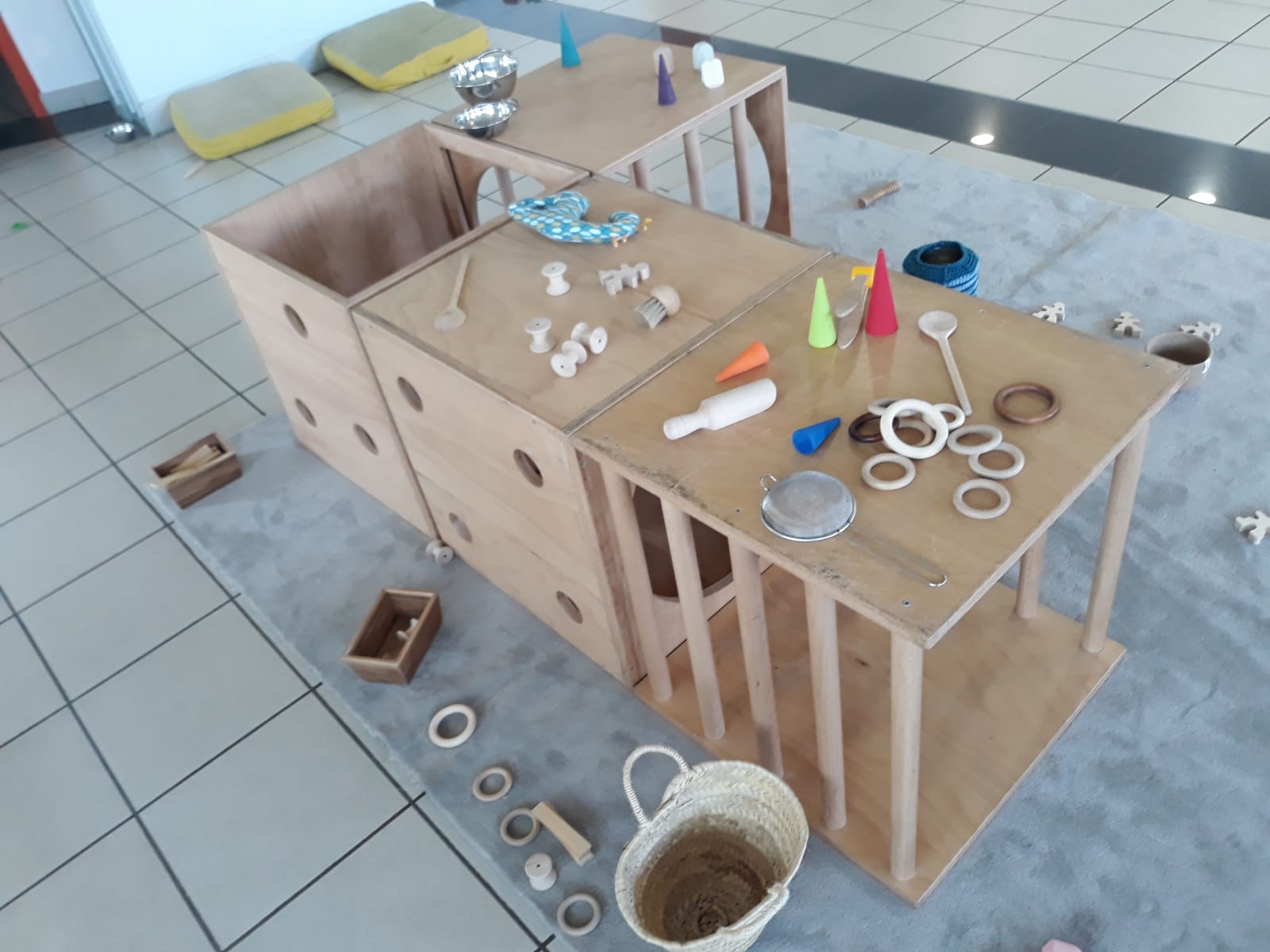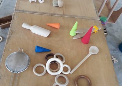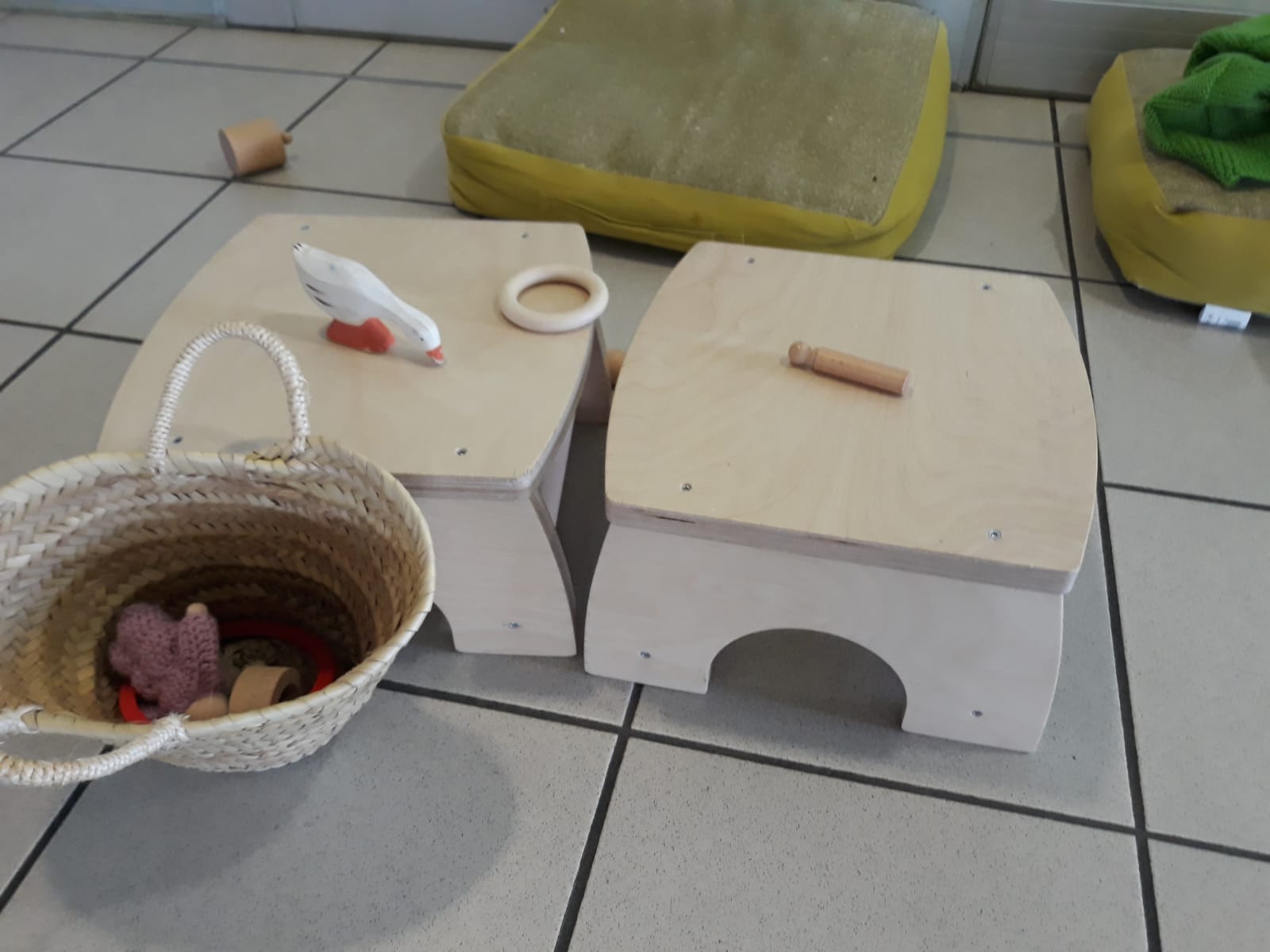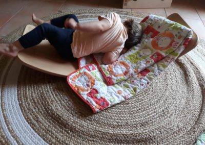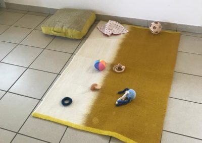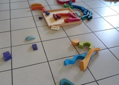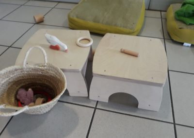 L’atelier du 3 juillet, le dernier de l’année, a accueilli 9 enfants : attentifs, actifs, certains apportent des objets vers leur parent et jouent à proximié, d’autres circulent dans la salle, s’installent au sol, construisent, lancent, empilent, se promènent avec une boîte, des tissus, une cuillère en bois… Et voilà ici un panier sur la tête, là 2 chenilles en bois tirées par leur ficelle, plus loin un bébé en équilibre sur ses 2 mains et 2 pieds, un autre qui tête lové dans les bras de sa maman… Balades dans le tunnel, aller et retour, coucou-caché avec son parent au loin, une main pousse un anneau par le trou d’un cube, puis un petit arbre en bois (tiens, ça passe pas !!), et l’arche en bois est gravie avec une assurance de plus en plus précise…