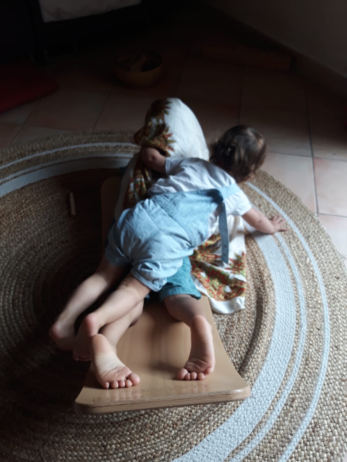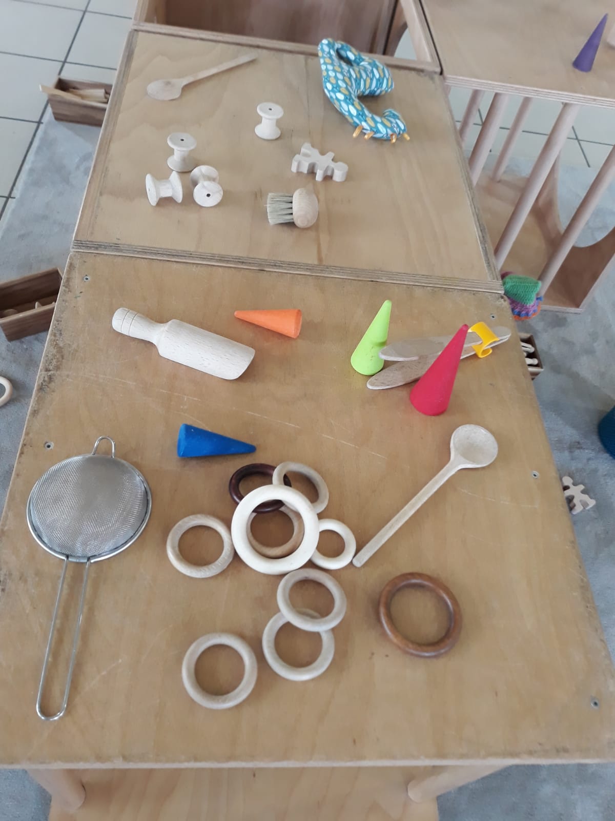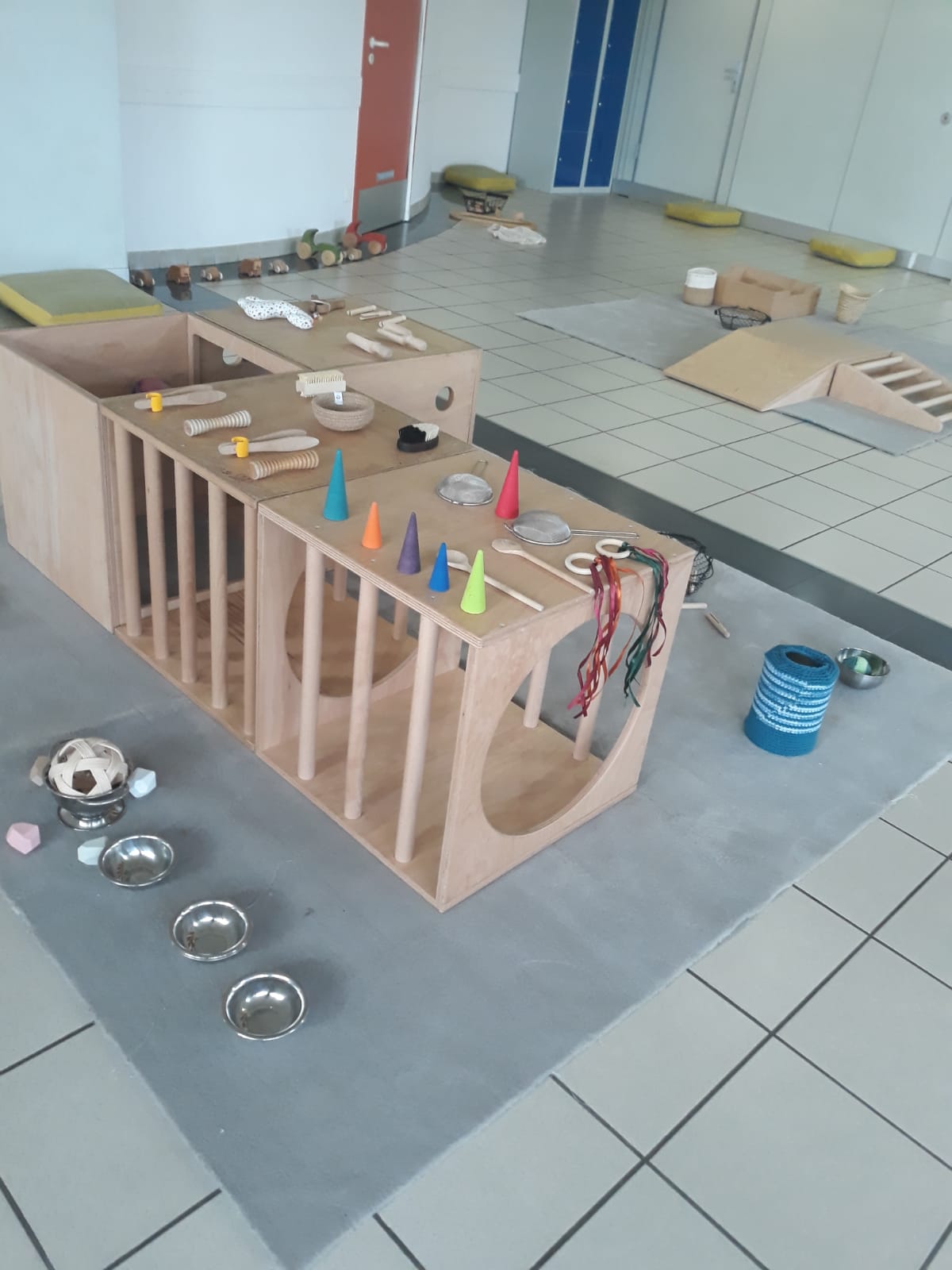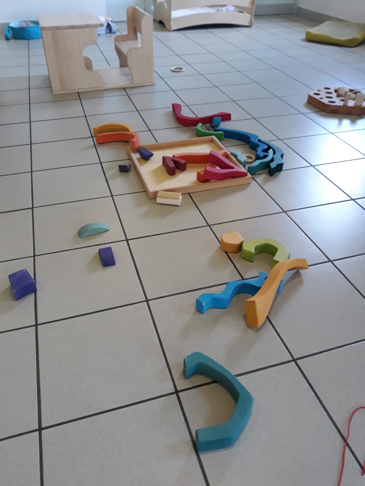 L’atelier du 3 juillet, le dernier de l’année, a accueilli 9 enfants : attentifs, actifs, certains apportent des objets vers leur parent et jouent à proximié, d’autres circulent dans la salle, s’installent au sol, construisent, lancent, empilent, se promènent avec une boîte, des tissus, une cuillère en bois… Et voilà ici un panier sur la tête, là 2 chenilles en bois tirées par leur ficelle, plus loin un bébé en équilibre sur ses 2 mains et 2 pieds, un autre qui tête lové dans les bras de sa maman… Balades dans le tunnel, aller et retour, coucou-caché avec son parent au loin, une main pousse un anneau par le trou d’un cube, puis un petit arbre en bois (tiens, ça passe pas !!), et l’arche en bois est gravie avec une assurance de plus en plus précise…