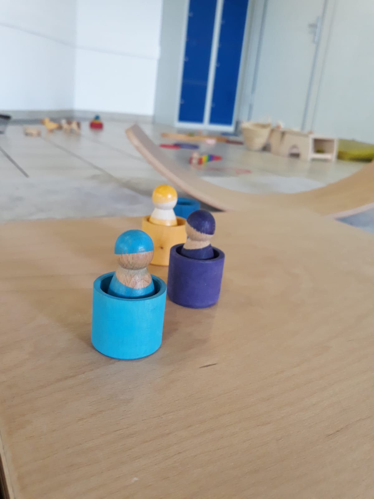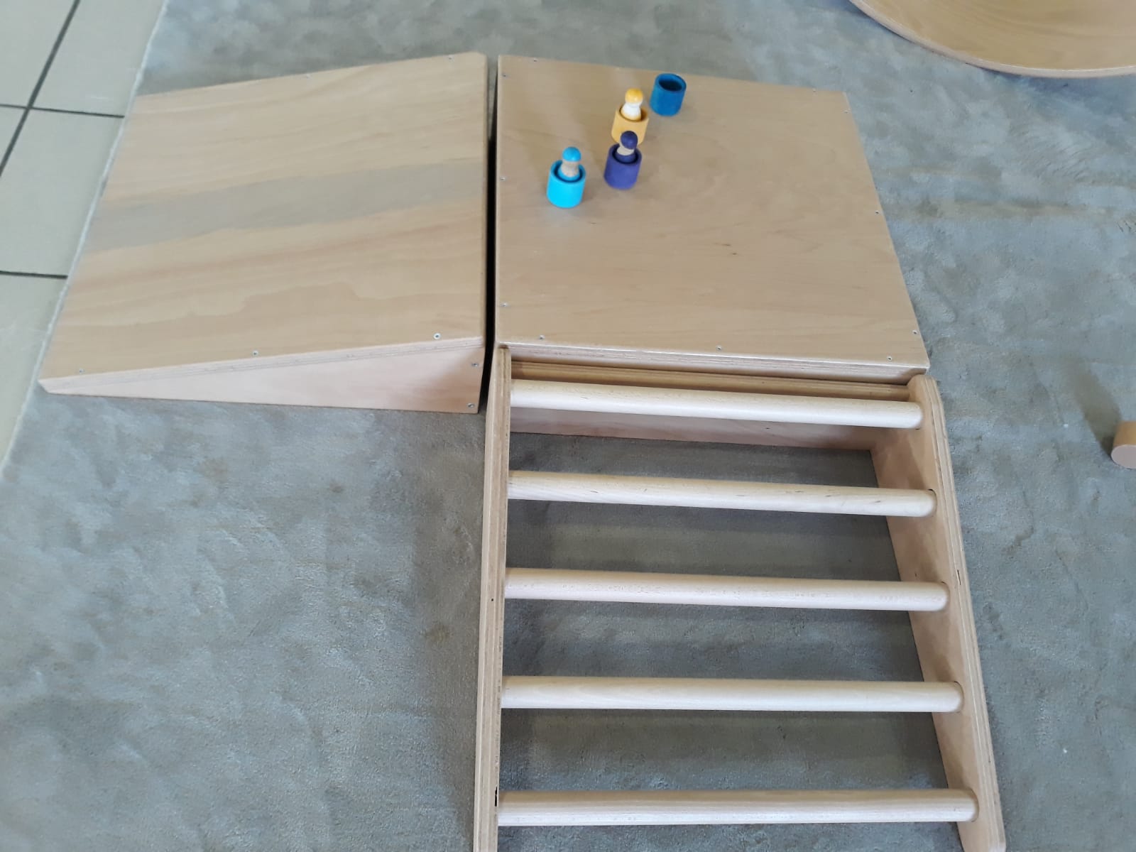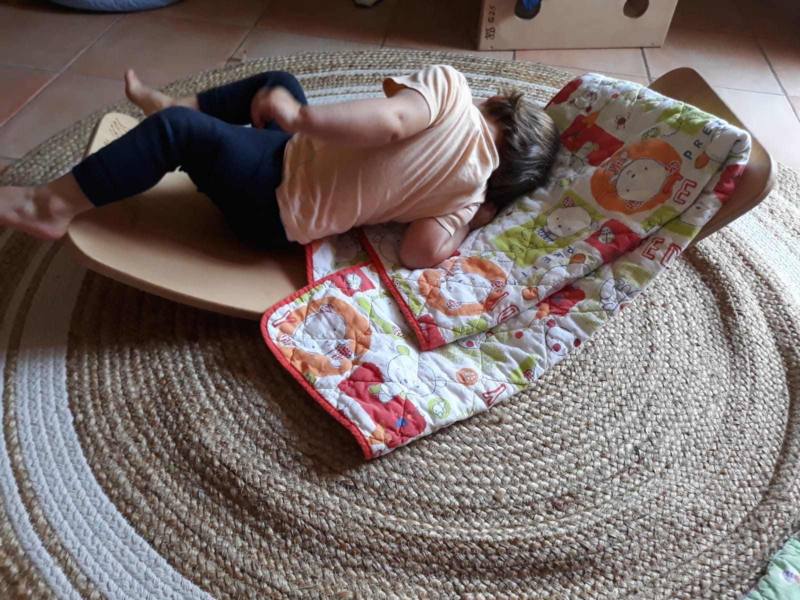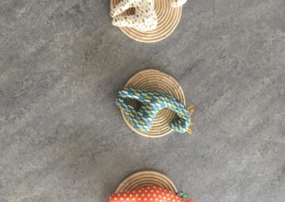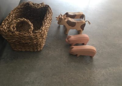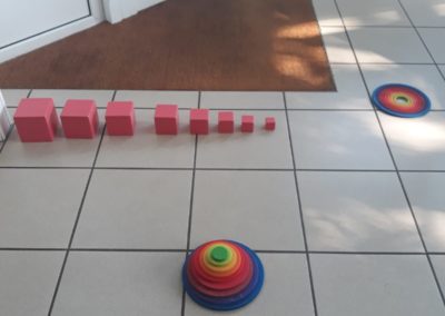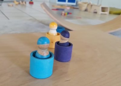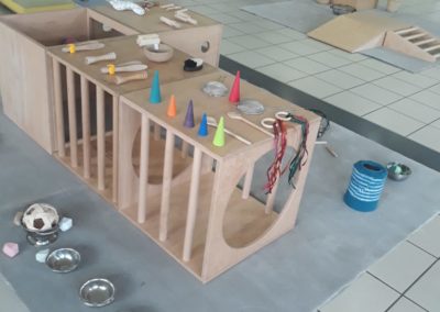 L’atelier du 3 juillet, le dernier de l’année, a accueilli 9 enfants : attentifs, actifs, certains apportent des objets vers leur parent et jouent à proximié, d’autres circulent dans la salle, s’installent au sol, construisent, lancent, empilent, se promènent avec une boîte, des tissus, une cuillère en bois… Et voilà ici un panier sur la tête, là 2 chenilles en bois tirées par leur ficelle, plus loin un bébé en équilibre sur ses 2 mains et 2 pieds, un autre qui tête lové dans les bras de sa maman… Balades dans le tunnel, aller et retour, coucou-caché avec son parent au loin, une main pousse un anneau par le trou d’un cube, puis un petit arbre en bois (tiens, ça passe pas !!), et l’arche en bois est gravie avec une assurance de plus en plus précise…
