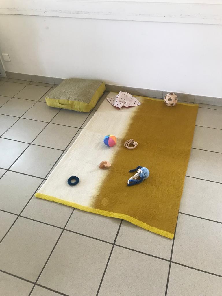 Les parents, assis au sol sur un coussin tout autour de la salle, observent leur enfant à distance : c’est un moment de pause, de tranquilité, de disponibilité.