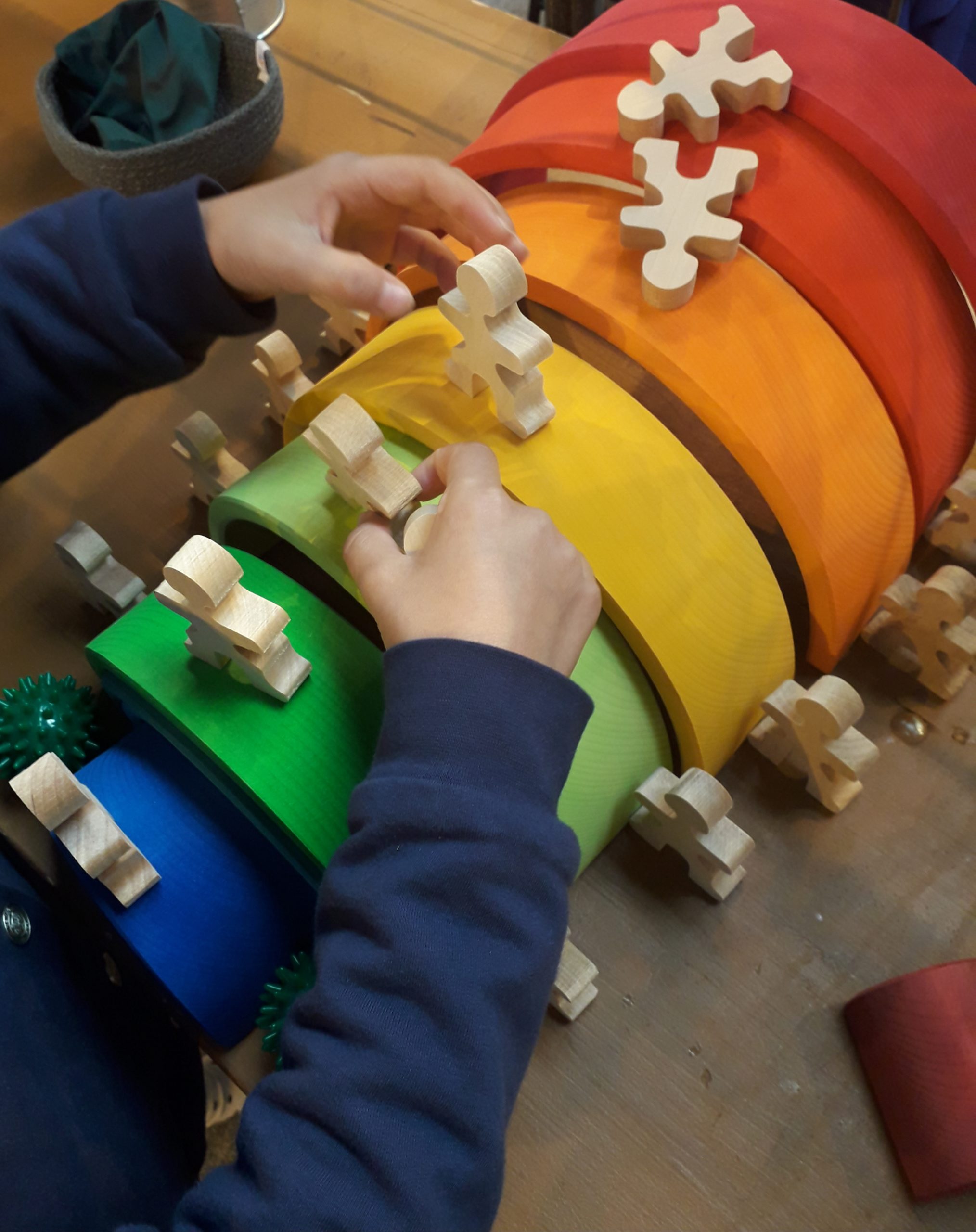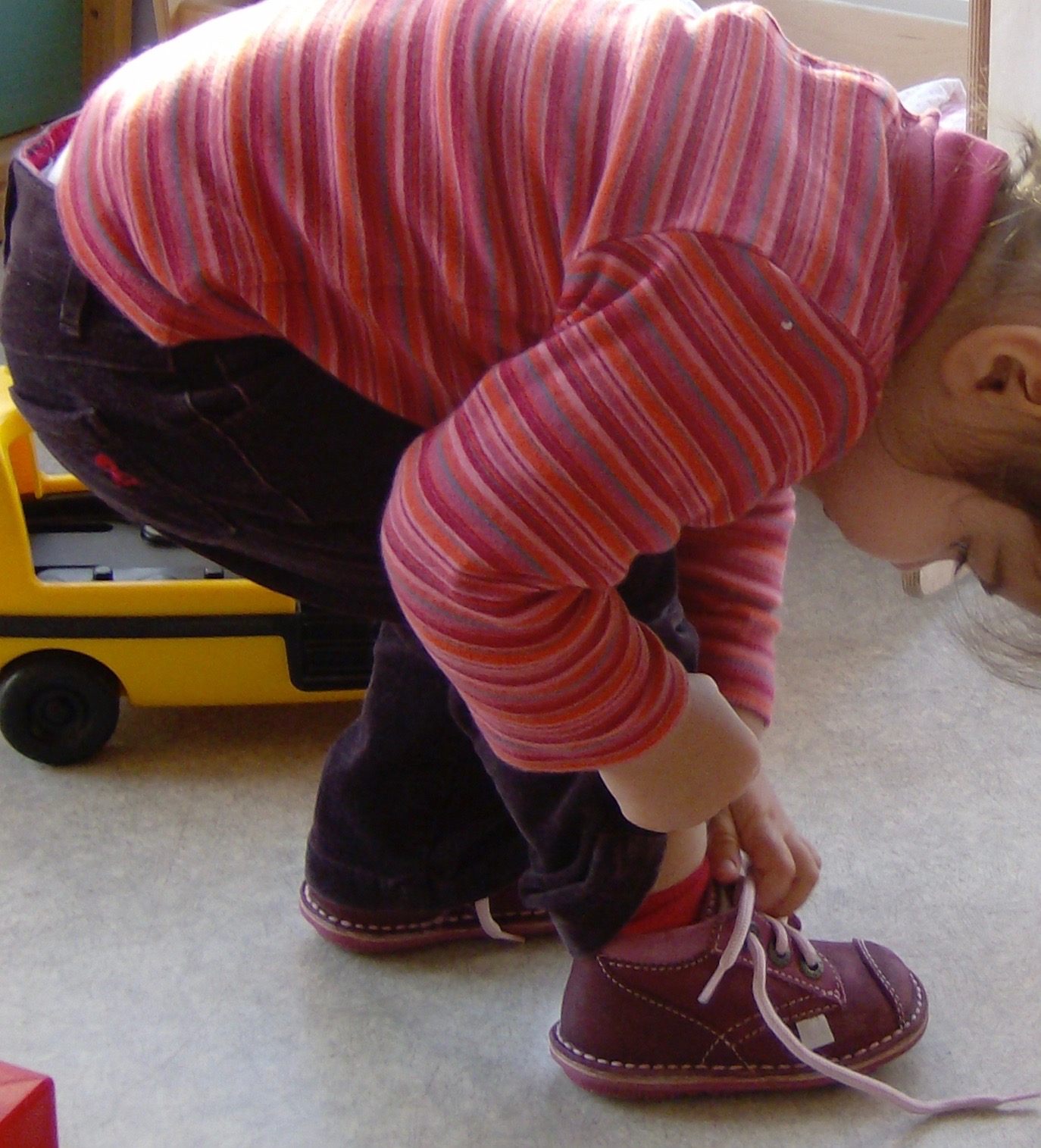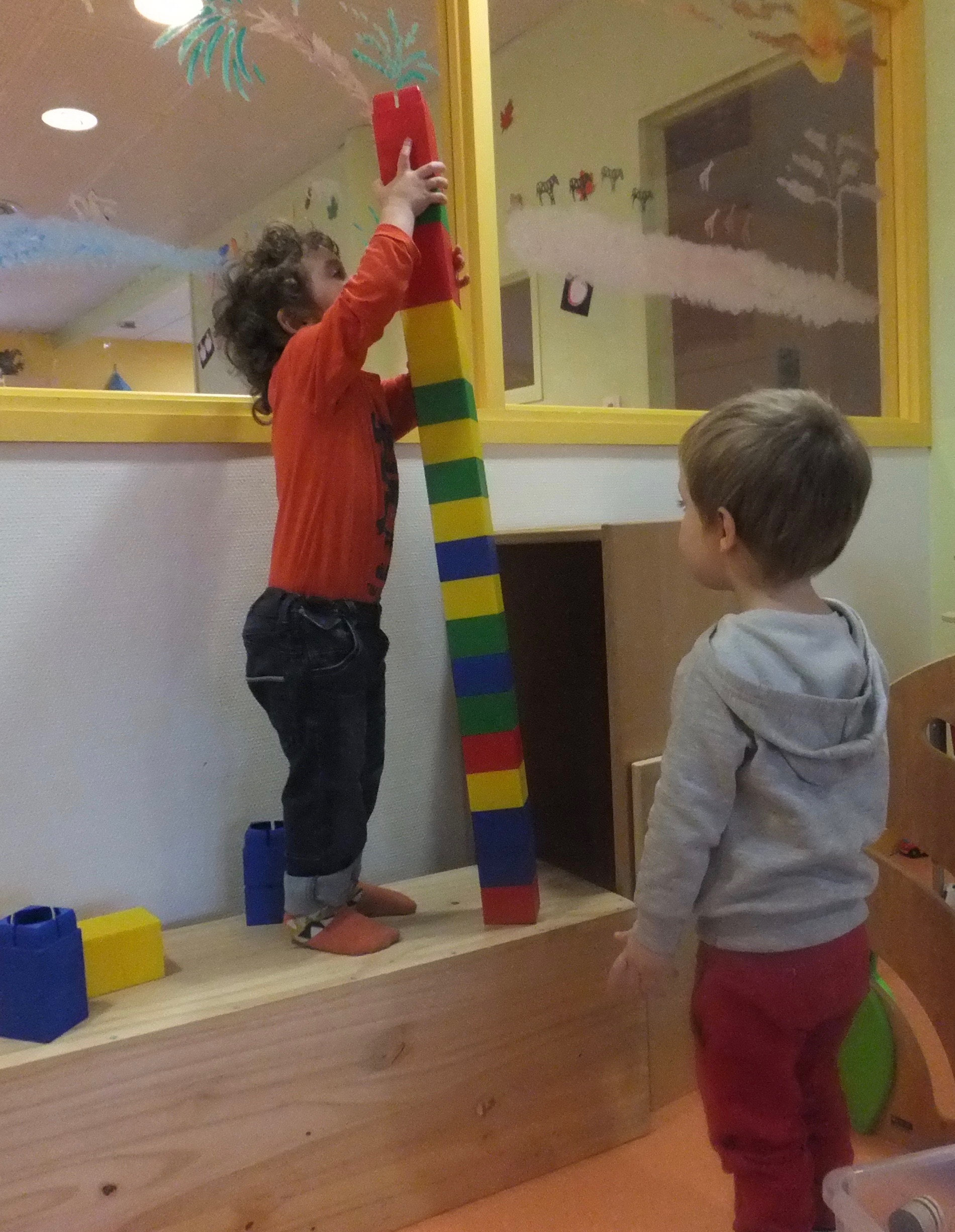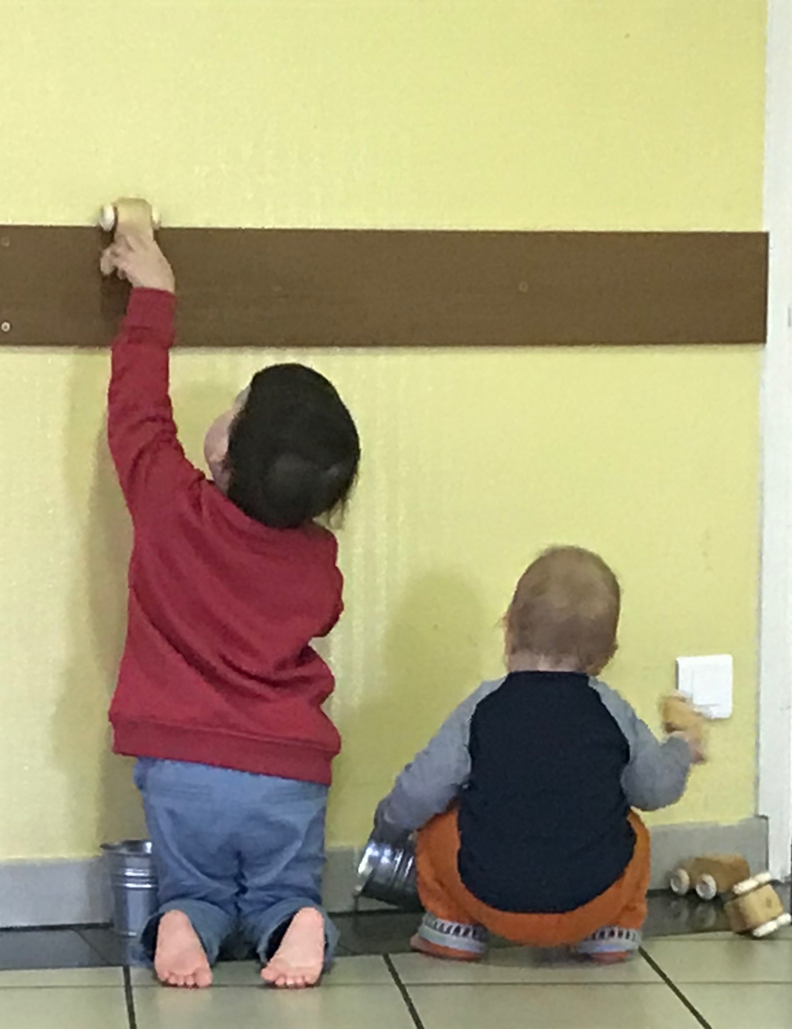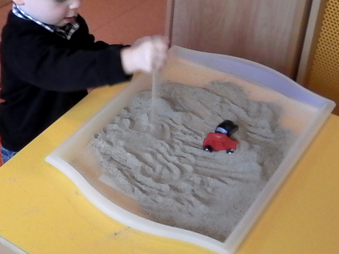 Faire un 1er petit tas avec les gravillons présents sur place, réfléchir ensuite au matériau du petit tas suivant. Regarder autour de soi, trouver des cailloux un peu plus loin. Les rassembler, les transporter, faire un ou deux trajets, juger de la quantité nécessaire pour avoir un petit tas de la même taille qu’à côté, ajuster. Partir en quête d’un 3ème matériau, trouver un petit bâton, en chercher d’autres, ratisser la pelouse, aller farfouiller dans les haies, à chaque bâton trouvé, venir déposer son butin. Juger de l’ensemble, faire quelques ajustements et être satisfaite du travail effectué.