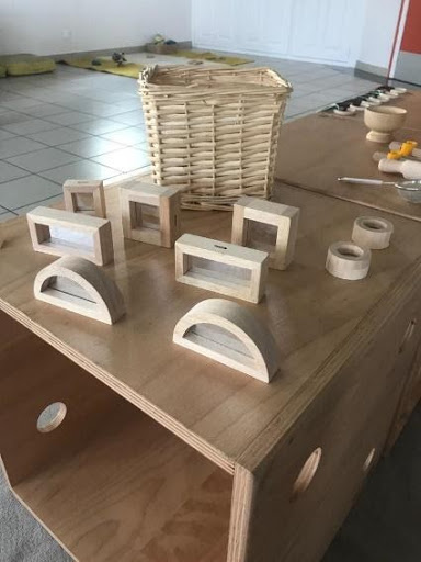 Pour les ateliers JejoueMot’ nous plaçons des objets sur les cubes, une invitation à se verticaliser, éveiller la curiosité en hauteur… Animaux en bois, ustensiles, petites brosses, cubes sensoriels, corbeilles…