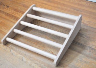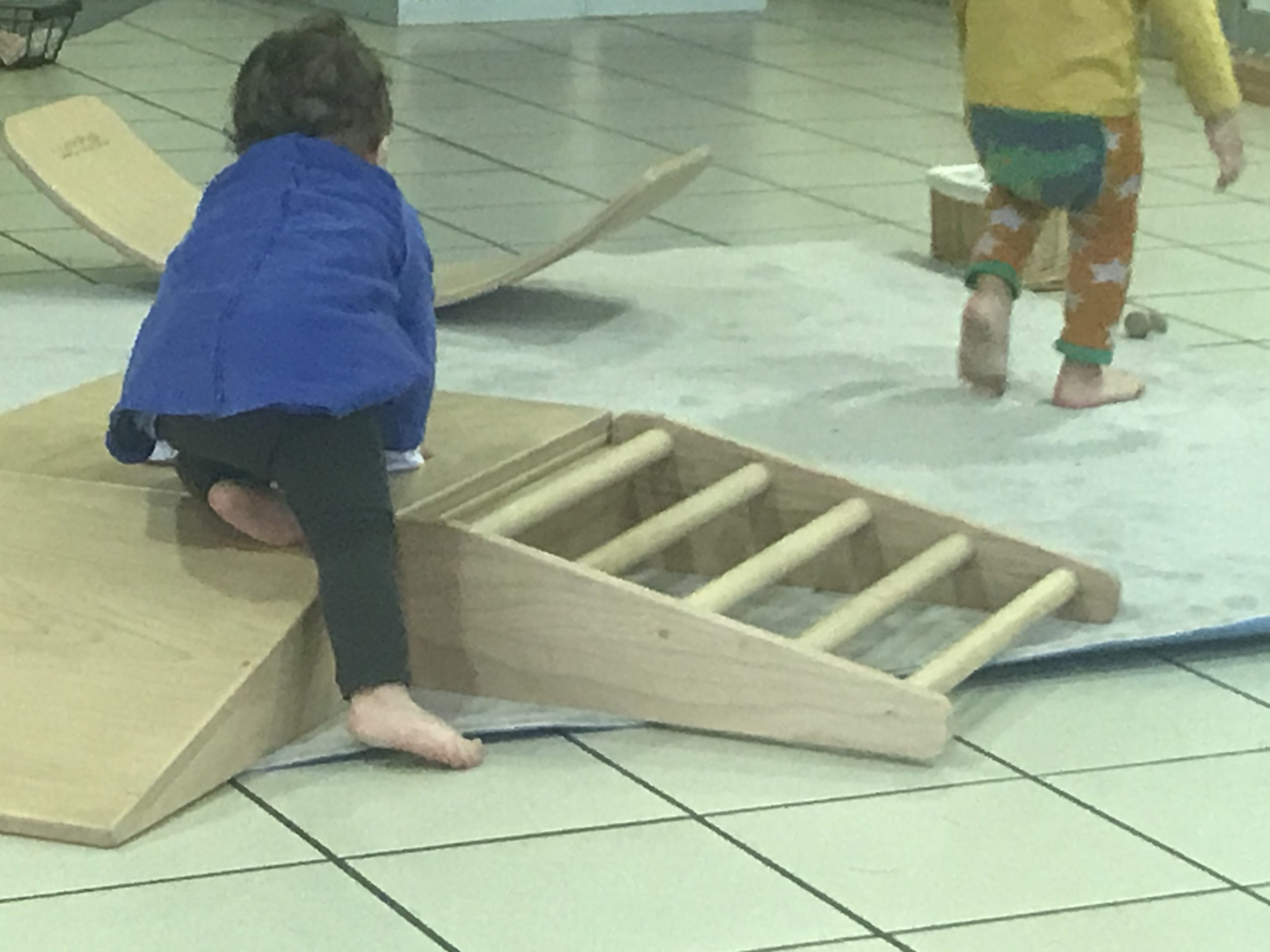La 1ère étape de cette nouvelle découverte est l’escalade sur l’objet en question, coussin, estrade, petit banc, petite chaise, rondin, marche, … Bien souvent l’enfant se place face à l’objet, se redresse sur ses genoux, il s’agrippe au dossier, sur les côtés, sur la surface si elle n’est pas trop lisse, les doigts crispés, le dos raidit, le corps entier tendu afin d’atteindre son objectif. Il monte un genou, ses fesses, puis l’autre genou, se retrouve à genoux sur l’objet de son ascension. L’enjeu à cette étape est de bien rester sur la surface en hauteur et de ne pas basculer en arrière lors du retournement. De nombreux essais seront nécessaires pour que l’enfant, trouve son équilibre, dose l’élan dont il a besoin, trouve la façon de procéder pour se retourner. Si l’enfant est monté via un plan incliné plein ou à barreaux, l’escalade s’est faite dans ce cas progressivement, une main après l’autre, un genou après l’autre.