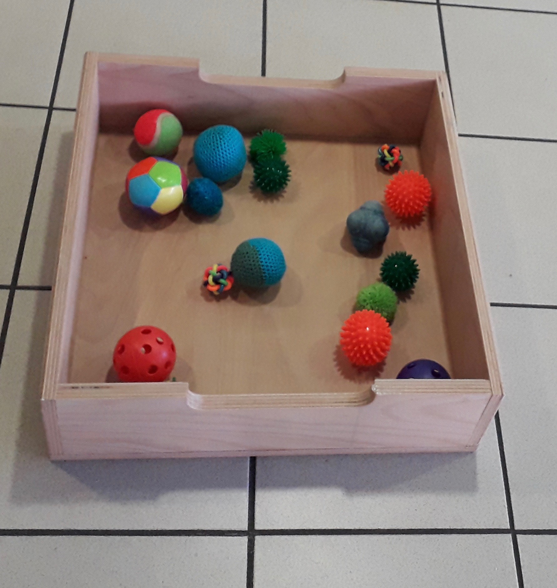 Réparties dans un contenant, les balles forment un ensemble d’objets variés d’une même famille et l’enfant peut ainsi faire son choix. Il entre et sort du contenant à 4 pattes, bien souvent en marche avant et les mains en premier !