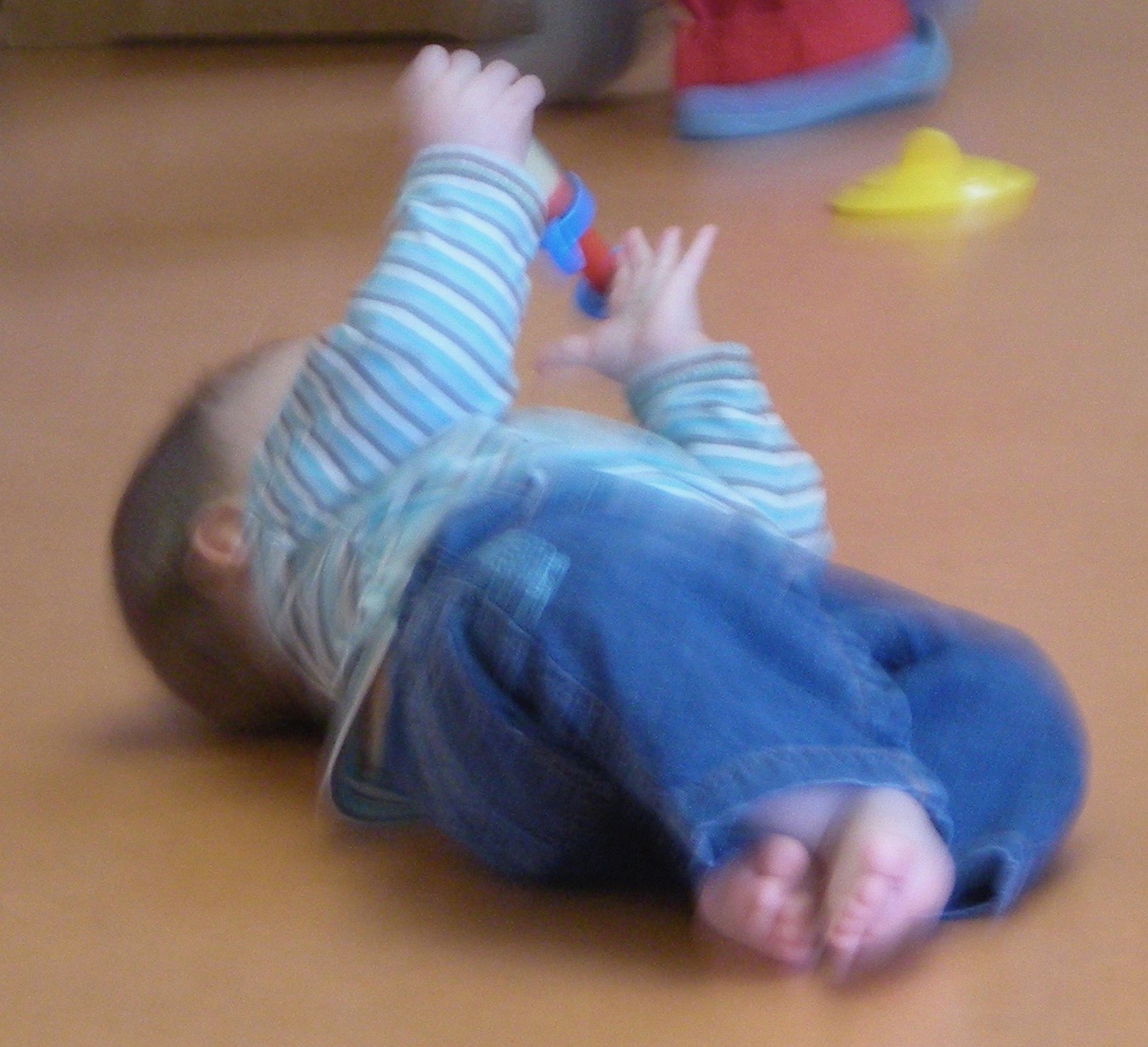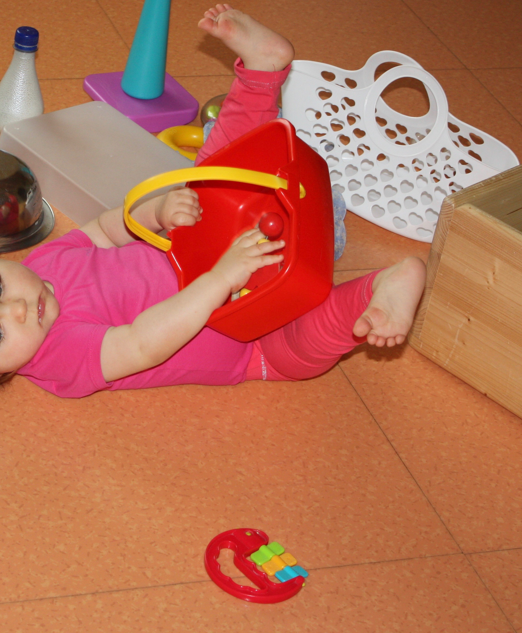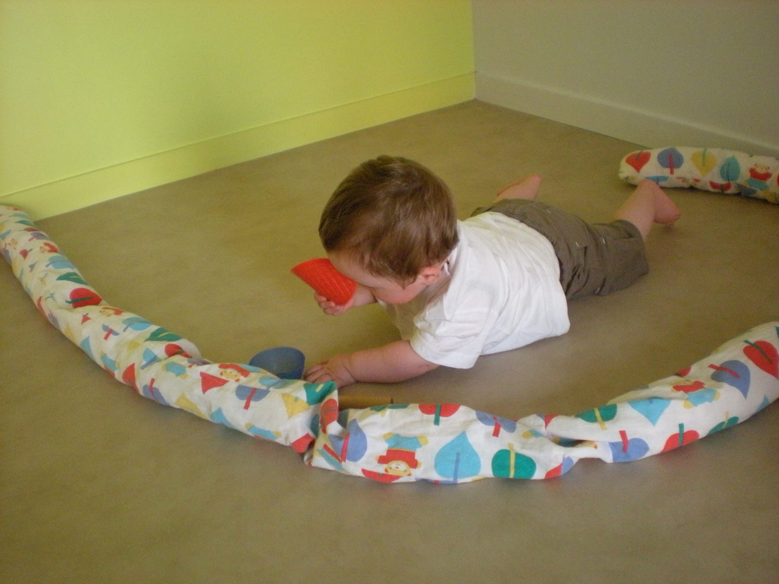 Ces expérimentations, l’agitation des bras et des jambes, le basculement du poids du corps vont le mener à la découverte de son 1er déplacement autonome : le déplacement en rond sur le ventre. Ce sont les prémices de la coordination et de l’équilibre bras/jambes.
