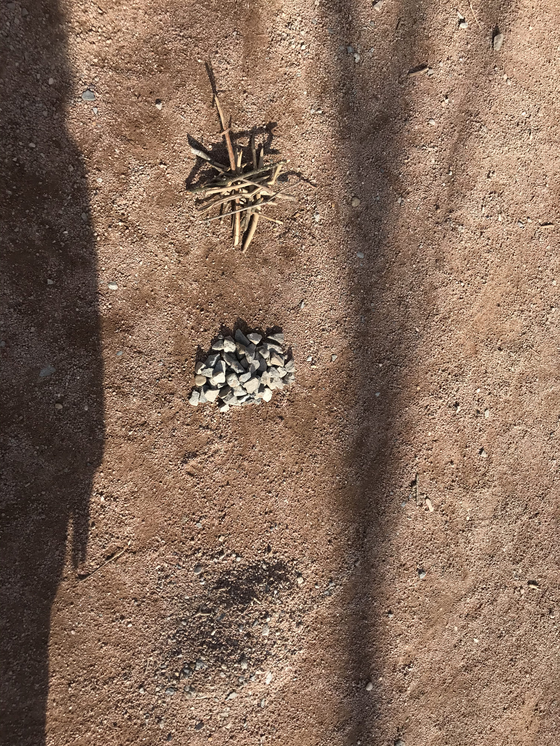 Faire un 1er petit tas avec les gravillons présents sur place, réfléchir ensuite au matériau du petit tas suivant. Regarder autour de soi, trouver des cailloux un peu plus loin. Les rassembler, les transporter, faire un ou deux trajets, juger de la quantité nécessaire pour avoir un petit tas de la même taille qu’à côté, ajuster. Partir en quête d’un 3ème matériau, trouver un petit bâton, en chercher d’autres, ratisser la pelouse, aller farfouiller dans les haies, à chaque bâton trouvé, venir déposer son butin. Juger de l’ensemble, faire quelques ajustements et être satisfaite du travail effectué.