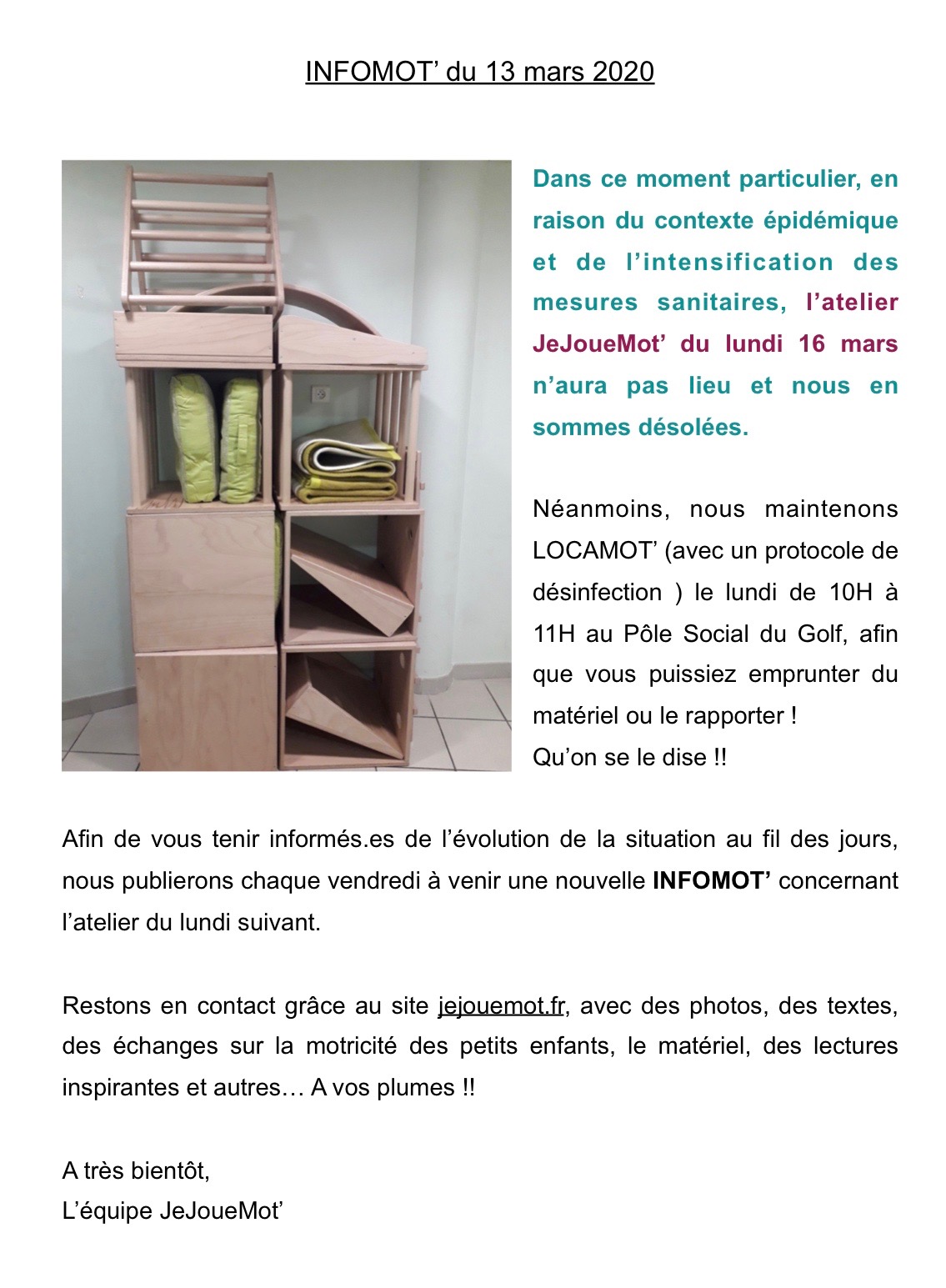 InfoMot’ par admin | Mar 13, 2020 | Blog, InfoMot' | 0 commentaires Poster le commentaire Annuler la réponseVotre adresse e-mail ne sera pas publiée. Les champs obligatoires sont indiqués avec *Commentaire * Nom * E-mail * Site web Enregistrer mon nom, mon e-mail et mon site dans le navigateur pour mon prochain commentaire. Oui, ajoutez-moi à votre liste de diffusion.