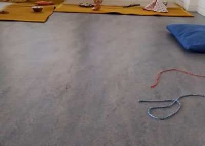 Beaucoup de musicalité lors de cet atelier, le son des bols et assiettes en métal sur le bois, sur le carrelage et entre eux. Cela n’a pas du tout dérangé le petit bébé de la matinée.