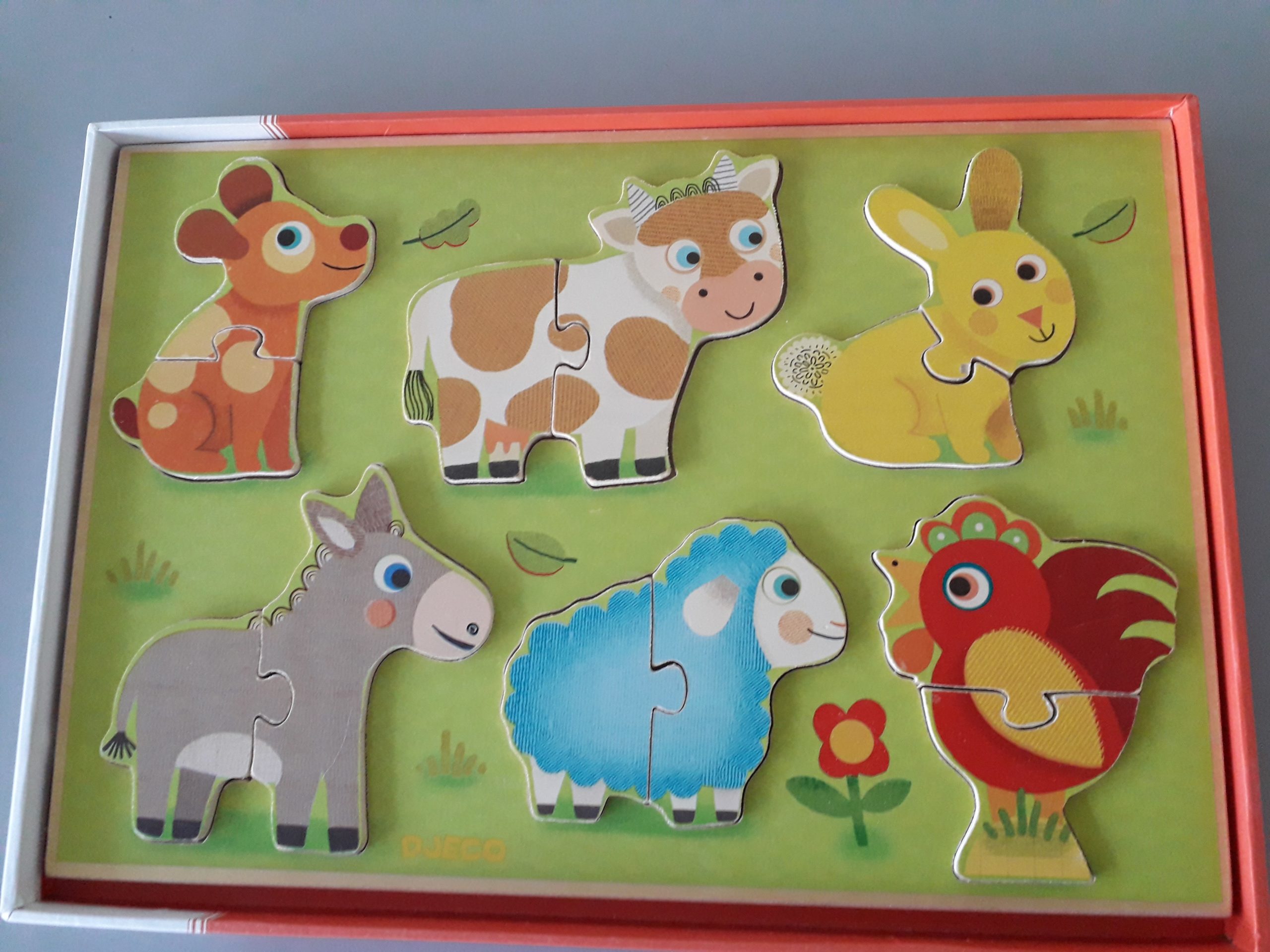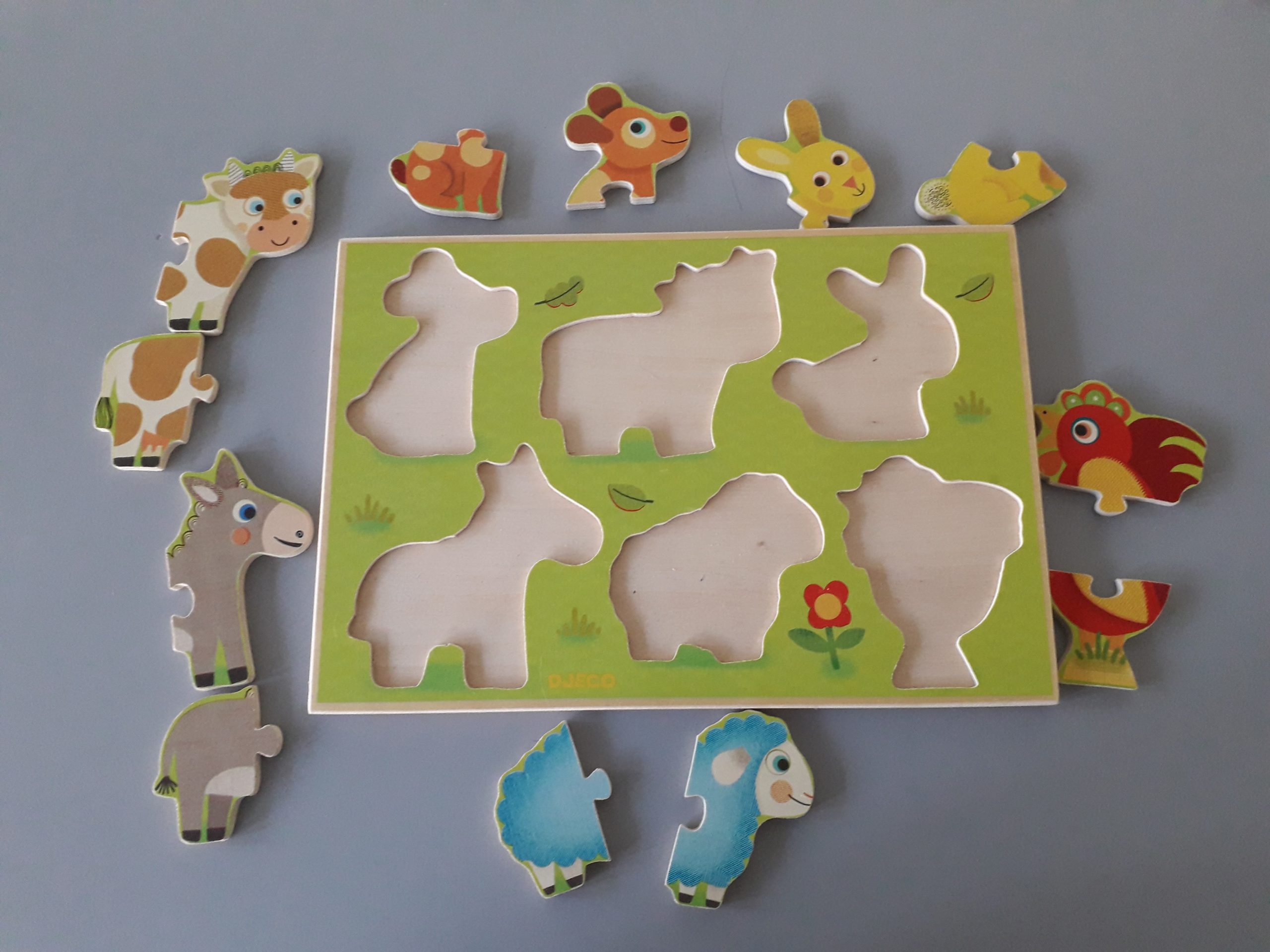 Chaque animal est en deux parties et à encastrer au bon endroit sur la plaque.