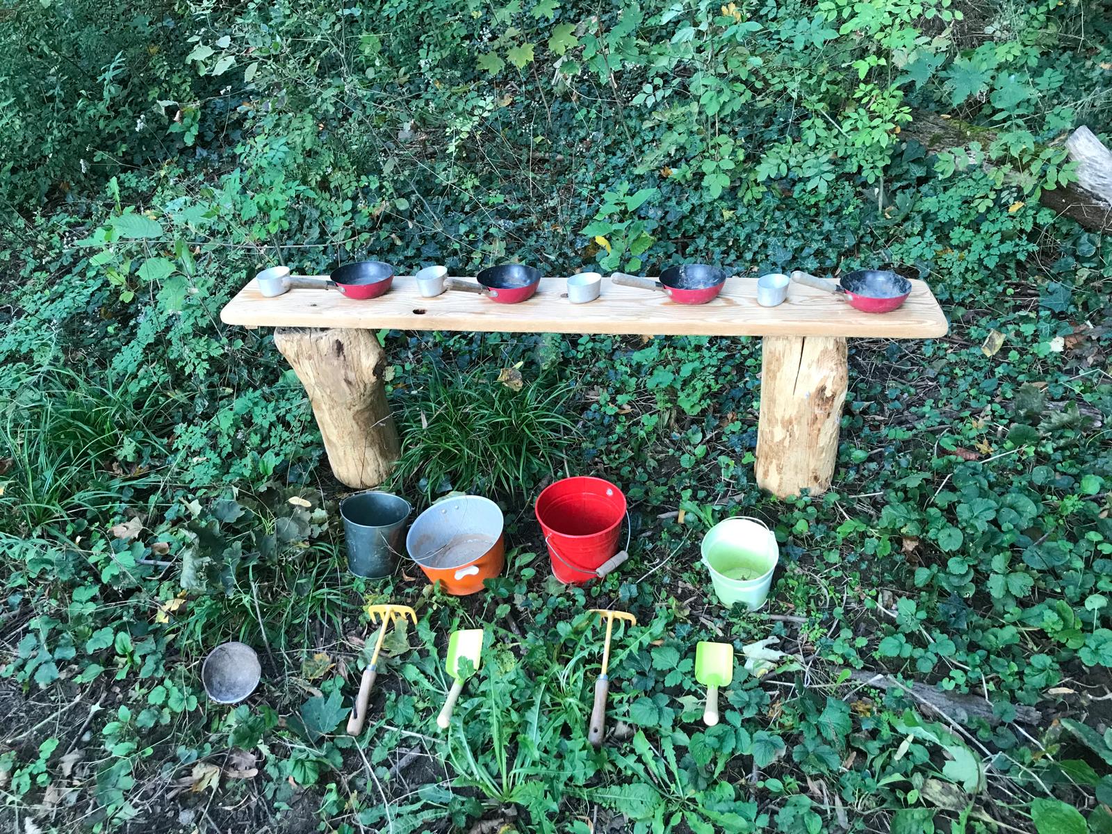 Assortiment d’ustensiles variés pour alimenter le jeu libre en nature. Contenants, passoires, éléments naturels, …